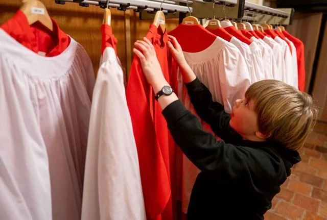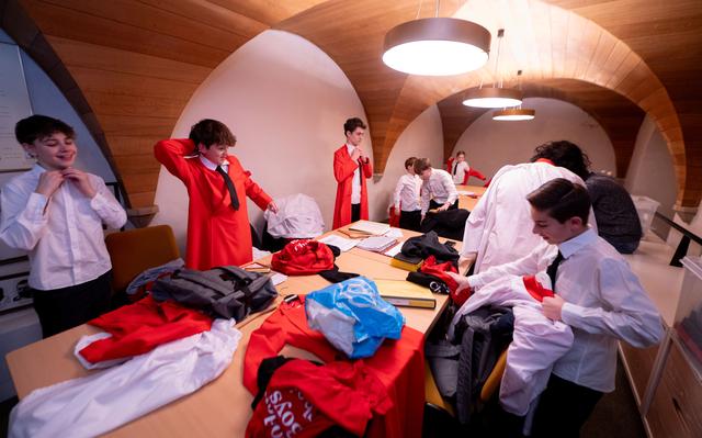 De jongens van het Roder Jongenskoor kleden zich om in een ruimte van de Grote Kerk in